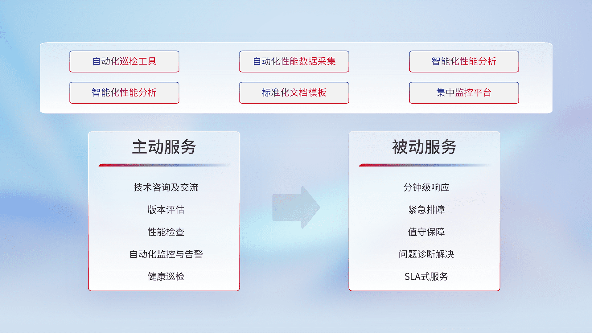 智能化工具和标准化文档,,,保障服务质量,,,,提供主动服务(包含技术咨询、、版本评估、、性能检查、、、自动化监控与告警、、健康巡检)和被动服务包含(分钟级响应、、、紧急排障、、、值守保障、、问题诊断解决、、、SLA服务)。。。